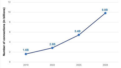 Fig. 1: Número real (2019, 2022) y previsto (2025, 2028) de conexiones IIoT a nivel mundial