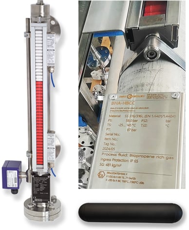 L’étiquette du produit indique l’application : Dans cet exemple, l’indicateur de niveau magnétique BNA est conçu pour le biopropane liquide. Le modèle BNA pour la mesure de niveau dans les bioraffineries – la version représentée est équipée d’un capteur magnétostrictif et de contacts de commutation – nécessite parfois un flotteur en titane revêtu de DLC (en bas à droite), en fonction des fluides de traitement respectifs.