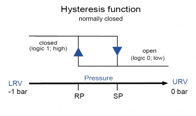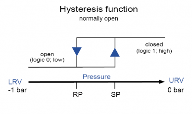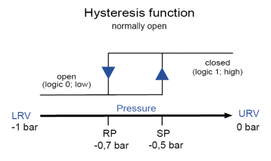 Het begin van het meetbereik (MRS) is daarom -1 bar, het einde van het meetbereik (MRE) 0 bar. Dit betekent: bij 0 bar (= begin van bedrijf) moet de schakelaar gesloten zijn om de vacuümpomp in te schakelen. Daalt de druk naar -0,7 bar, dan moet de schakelaar openen en de pomp stoppen. Zodra de druk de bovenste limietwaarde van -0,5 bar bereikt, moet de pomp nog een keer opstarten en draaien totdat de druk weer tot -0,7 bar is gedaald.