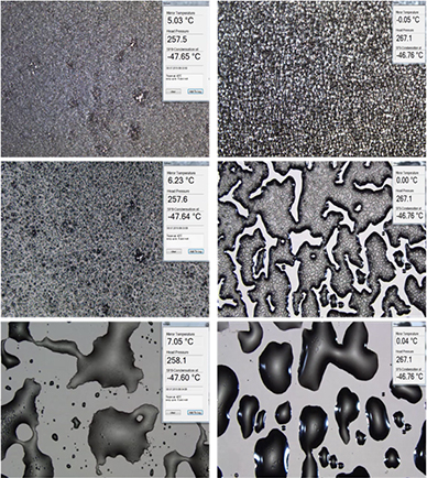 Rysunek 2 przedstawia porównanie temperatur topnienia warstwy lodu w SF6 i w powietrzu. Podczas gdy temperatura topnienia w powietrzu wynosi 0,01°C, w SF6 przesuwa się ona do zakresu od 5 do 7°C z powodu tworzenia się hydratów. Rysunek przedstawia zdjęcia mikroskopowe powierzchni lustra, które pokazują – od góry do dołu – warstwę lodu, początek procesu topnienia oraz całkowite stopienie.