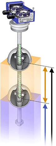 Esta configuração padrão pode ser modificada com muita facilidade para permitir o monitoramento dos níveis de dois líquidos ao mesmo tempo. Em aplicações de interface, um segundo transmissor de cabeçote pode ser usado para avaliar a posição de um segundo flutuador. Isso significa que um instrumento de medição com uma cadeia reed pode monitorar dois flutuadores por meio de dois flutuadores independentes de sinal de saídas 4 … 20mA/HART®. Assim, monitorar aplicações de interface com dois flutuadores não é problema para o transmissor de nível reed.